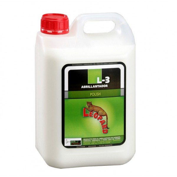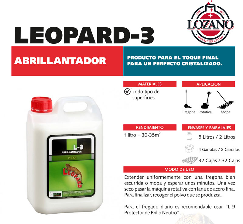 Leopard-6 Abrillantador Pulimentable: Emulsión de ceras sintéticas y resinas, formulada para el mantenimiento de pizarra, barro, mármol, terrazo y todo tipo de superficies. Se trata de un producto de gran resistencia al tráfico intenso.