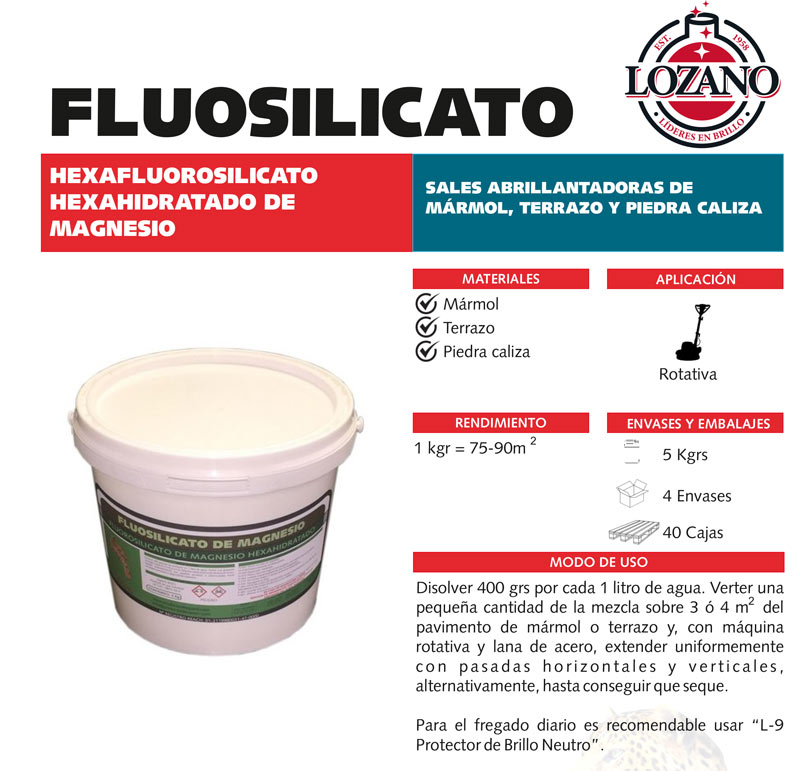 Producto en forma de sal sólida cristalina. Genera una reacción química con el carbonato cálcico de los mármoles, terrazos o piedras calizas, que se traduce en un brillo tipo espejo.